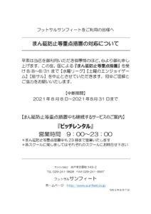 平素は当店を御利用いただき御厚情のほど、心より御礼申し上げます。この度、国による『まん延防止等重点措置』を受け8/8~8/31まで【水曜リーグ】【土曜のエンジョイゲーム】【個サル】を中止とさせていただきます。何卒ご理解とご協力をお願いいたします。