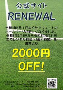 また、ホームページリニューアルキャンペーンとして令和3年5月1日から5月31日までレンタルピッチのお得なキャンペーンを行います。運動するには最適な季節ですので皆様のご利用お待ちしております。